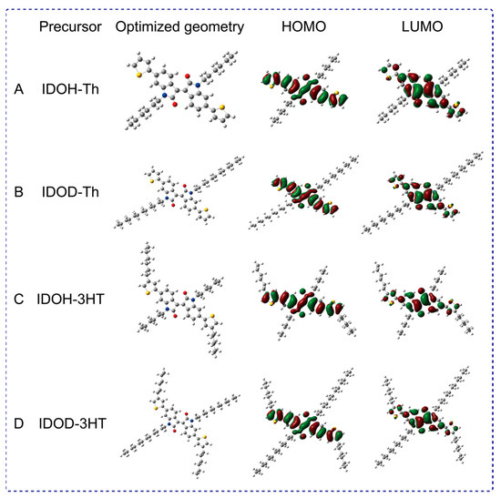 Optimized geometries and HOMO–LUMO orbital distribution of IDOH–Th (A), IDOD–Th (B) IDOH–3HT (C), and IDOD–3HT (D).