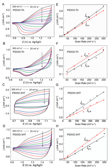 Cyclic voltammograms of (A) PIDOH–Th, (B) PIDOD–Th, (C) PIDOH–3HT, and (D) PIDOD–3HT film–modified Pt electrodes at varying scan rates. The scan rates are 300 mV s−1, 250 mV s−1, 200 mV s−1, 150 mV s−1, 100 mV s−1, 50 mV s−1, 25 mV s−1, respectively. Corresponding linearity of current density versus scan rate of the doping process for (E) PIDOH–Th, (F) PIDOD–Th, (G) PIDOH–3HT, and (H) PIDOD–3HT. jp,a (dots) and jp,c (square) denote the anodic and cathodic peak current densities, respectively.