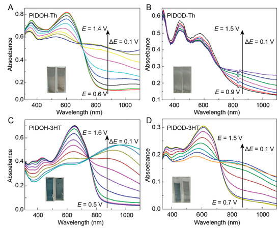 Optical absorption spectra of PIDOH–Th, PIDOD–Th, PIDOH–3HT, and PIDOD–3HT films are explored under different applied voltages in CH3CN–Bu4NPF6 (0.1 mol L−1) (Figure 5). All polymers possess two maximum absorption peaks where the absorption bands at the longer wavelengths originate from the π–π* transition of conjugated structures and at the shorter wavelengths can be attributed to the charge transport between donor and acceptor units [15,20,38]. Particularly, the absorption maxima for PIDOH–3HT and PIDOD–3HT bathochromically shift compared with PIDOH–Th and PIDOD–Th, suggesting that the introduction of side alkyl chains on donor units not only increases the electron–donation ability but also improves electrochemical and optical performance. Furthermore, the optical band gaps of polymers exhibit the following trend: 1.91 eV (PIDOH–Th/PIDOD–Th) > 1.89 eV (PIDOD–3HT) > 1.87 eV (PIDOH–3HT). This phenomenon can be explained by PIDOH–3HT films having better conjugated structures with the elongation of alkyl side chain length on donor units. As the applied voltage increases, the peak absorption intensity slowly decreases or even diminishes, and a new optical absorption peak appears in the near–infrared region, which proves the formation of polaron and bipolaron in the process of electrochemical polymerization [16,18,39]. During the transition from the neutral state to the oxidized state (Figure 5A,B), PIDOH–Th and PIDOD–Th films display no clear color changes and remain light gray between the doped and dedoped states. In contrast, PIDOH–3HT and PIDOH–3HT films reveal distinct colors ranging from dark blue in the neutral state to blue gray or gray in the oxidized state.