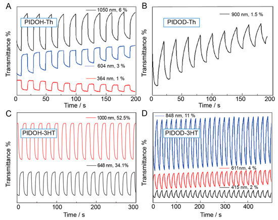 Time–transmittance profiles of (A) PIDOH–Th, (B) PIDOD–Th, (C) PIDOH–3HT, and (D) PIDOD–3HT at a switching time of 5 s under different wavelengths.