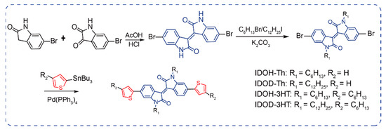 IDOH–Th, IDOD–Th, IDOH–3HT, and IDOD–3HT were synthesized through Stille coupling. The explicit synthetic routes are described in Scheme 1. (E)–6,6′–dibromo–1,1′–dihexyl–[3,3′–biindolinylidene]–2,2′–dione (IDOH), 6,6′dibromoindoledione, and (E)–6,6′–dibromo–1,1′–didodecyl–[3,3′–biindolinylidene]–2,2′–dione (IDOD) were synthesized according to literature procedures [10,13,18].