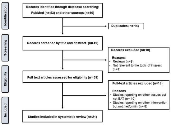The Preferred Reporting Items for Systematic reviews and Meta-Analyses (PRISMA) guidelines were followed to conduct this scoping review, and these are found at https://www.prisma-statement.org/Extensions/ScopingReviews?AspxAutoDetectCookieSupport=1 (Supplementary Materials, accessed on 10 January 2023). The protocol for the current review was not registered; however, well-established online databases such as The International Prospective Register of Systematic Reviews (PROSPERO) were accessed and screened to identify or eliminate any similar reviews being conducted. Briefly, a systematic search was conducted by two independent reviewers, in consultation with an experienced librarian, through major electronic databases and search engines such as PubMed/MEDLINE, Google Scholar, and the Cochrane library to retrieve relevant studies on the impact of metformin on regulating BAT thermogenic activity to modulate complications linked with obesity. The following search terms, including relevant synonyms, were applied: “metformin”, “brown adipose tissue”, and “obesity”. Studies reporting on other tissues other than BAT were excluded, as demonstrate in Figure 1. To enhance the relevance of the current manuscript, review papers were only screened for primary studies, whilst letters to the editor were excluded. In this review, particular attention was given to the experimental evidence highlighting the role of metformin in targeting BAT to combat obesity and its sequelae. Thus, extracted data items (from relevant literature) include the experimental model used, the dose and intervention period for metformin, as well as the main findings for the intervention concerning its potential antiobesity effects.