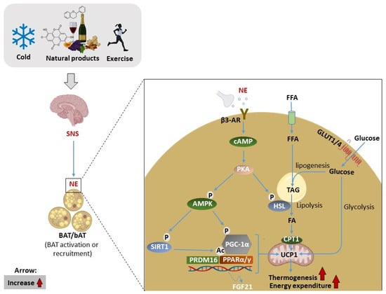 Illustration of the general mechanism of brown adipose tissue (BAT) activation and recruitment, as well as the other molecular mechanisms involved. Briefly, cold exposure, exercise, natural/pharmacological products, and other stimuli can activate sympathetic neurons innervating BAT release norepinephrine (NE), which binds to β3-adrenergic receptors (β3-AR) converting ATP to cyclic adenosine monophosphate (cAMP). Subsequently, cAMP activates protein kinase A (PKA), which then activate hormone-sensitive lipase (HSL) to liberate fatty acids (FAs) from triacylglyceride (TAG) stores through lipolysis, which in turn upregulate uncoupling protein 1 (UCP1) located in the mitochondria. Subsequently, the uptake of circulating free fatty acids (FFAs) and glucose contributes to the regeneration of intracellular triglyceride stores. Glucose is transported into the cell by glucose transporters (GLUTs), while FFAs are transported via cluster of differentiation 36 (CD36). On the other hand, activation of AM-activated protein kinase (AMPK) induces the complex of adipogenic and thermogenic transcriptional factors such as NAD-dependent deacetylase sirtuin-1 (SIRT1), proliferator-activated receptor gamma coactivator 1-alpha (PGC1α), and transcriptional factor PR domain containing 16 (PRDM16), which in turn increase UCP-1-driven thermogenesis and energy expenditure.