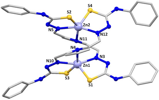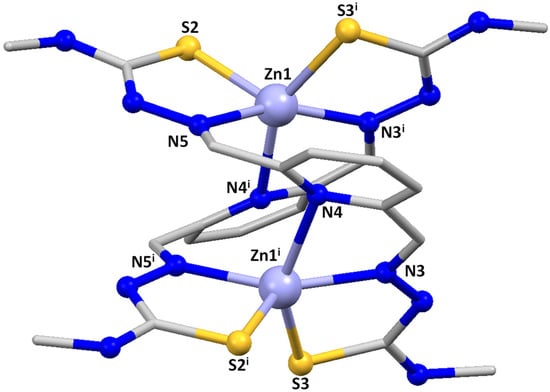 In the last few years, our group has demonstrated that pentadentate bisthiosemicarbazones can act as useful building blocks for generating novel supramolecular motifs, such as helicates, cluster helicates or mesocates [26,27]. Moreover, we have demonstrated that the nuclearity and the ligand arrangement exhibited by pentadentate thiosemicarbazone complexes depend on the metal size and the deprotonation degree of the ligand [28]. In addition, the synthetic procedure employed can determine the shape and nuclearity of the final supramolecular arrangement. More in particular, Zn(II) ions in combination with dianionic bisthiosemicarbazones featuring a pyridine spacer give rise to dinuclear bishelicoidal Zn(II) neutral complexes displaying different internal coordination modes for the two zinc ions that can be described as [6+6], [6+4], [5+5] and [4+4] in the solid state [28,29,30,31,32].