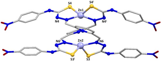 The different coordination isomers that have been found in the solid state for the bisthiosemicarbazone zinc dihelicates with pyridine spacer have been analyzed in the literature. Thus, structures have been found of the types [6+6] [29,31], [6+4] [28,29], [5+5] [32] and [4+4] [30]. In some cases, two coordination isomers have been isolated for the same ligand, indicating that the energy differences between them should be small. The reported and the herein-described results seems to corroborate that the introduction of different substituents in the 4-N terminal position of the bisthiosemicarbazones is not a determining factor for obtaining a particular coordination isomer in the case of this type of zinc dihelicate.