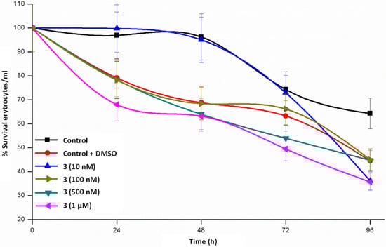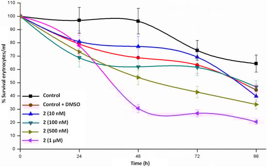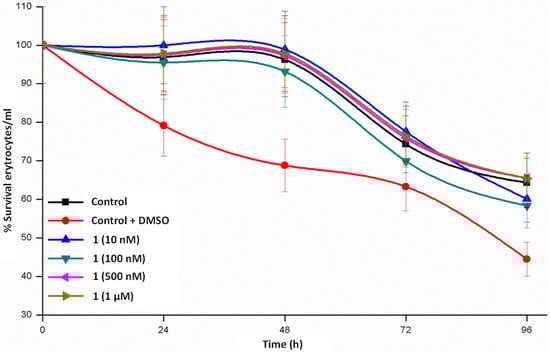 Maintenance of erythrocytes in culture conditions for 24–48 h (Figure 4, Figure 5 and Figure 6) does not produce significant changes, a complete survival being observed in the case of 1, whereas the survival rate lies in the interval of 55–80% in 2 and 65–80% in 3. When the cultures are maintained for 96 h, the three complexes diminish the survival rate but is still relevant. From these data we could stay that helicate 1 is the less toxic drug for a healthy cell line, even at high concentrations and at long assay times.