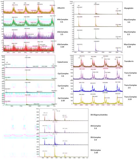 The three tested helixes showed similar results, so as a representative example in Figure 7 we show the mass spectra obtained during the titration of albumin, myoglobin, cytochrome C and transferrin proteins, and double-stranded oligonucleotides (DS) stock solutions with helicate 1 (see Figures S10–S19 for more details).