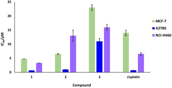 Representation of the IC50 values for zinc helicates and cisplatin against MCF-7, A2780 and NCI-H460 tumor cell lines.