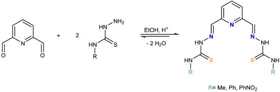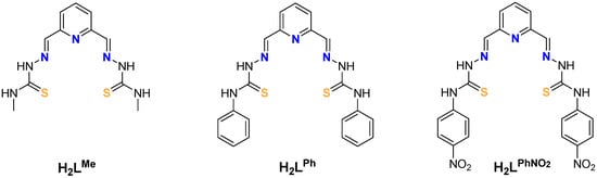 The ligands were prepared by the reaction between 2,6-pyridin-dicarboxaldehyde and 4-N-R-3-thiosemicarbazides (R = Me, Ph and PhNO2) in a 1:2 ratio, using absolute ethanol as solvent (Scheme 2). The solids obtained were characterized by elemental analysis, infrared, mass spectrometry and NMR spectroscopies (Figures S1–S6, Supplementary Materials).