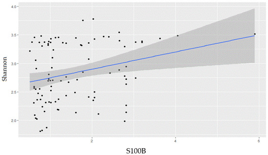 Relationship between concentration of S100B and Shannon alpha-biodiversity index. The scatterplot shows a positive correlation between S100B concentration (ng/mL) and Shannon values. The regression equation was Y = 0.15X + 2.59 without the 0 values (intercept 2.4–2.8).