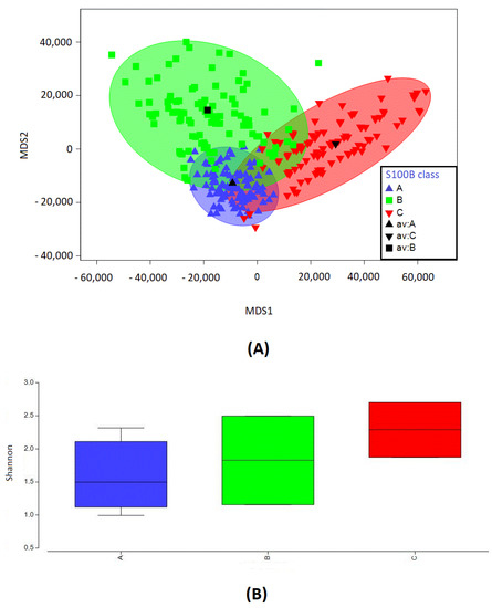 (A) Correlation between S100B levels and the microbiota biodiversity clusters samples into 3 groups. Bootstrap average analysis of the microbiota composition in relationship with levels of S100B (A = lower than 1.75 ng/mL, B = between 1.76 and 2.4 ng/mL, C = higher than 2.5 ng/mL). (B) Shannon index values with respect to S100B clusters. Box plots represent the distribution of calculated Shannon index for microbiota samples based on the different levels of S100B (A = lower than 1.75 ng/mL, B = between 1.76 and 2.4 ng/mL, C = higher than 2.5 ng mL).