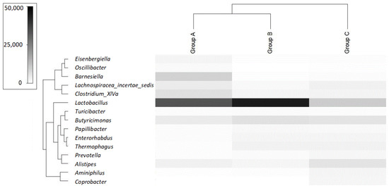 Operational taxonomic units (OTUs) were analyzed by SIMPER analysis, to identify possible differences in the distribution of different microbial species within the three S100B clusters identified by the bootstrap method. The hierarchical clustering of samples was performed based on genus-level classification. Main differences are reported in Figure 4, showing which OTUs significantly contributed to the variations in between-sample diversity in relation to the S100B threshold levels. The significant (p < 0.0002) dissimilarities between the groups were 87.64%, 88.76% and 85.51%, respectively, for A versus C, A versus B and C versus B. A consistent difference in the OTU distribution of microbial species was observed in the three clustering groups. Fifteen significant OTUs were identified as being mostly affected by the protein level. A linear positive or negative trend was not observed between the S100B concentration and each specific OTU. However, several OTUs showed higher representation in some of the clustering groups, suggesting a tendency based on the different A, B, C groups of protein concentrations. Some OTUs showed increased representation at the lowest or highest S100B concentrations (group A and C, respectively). Other OTUs, instead, were more represented at an intermediate concentration (group B). OTUs belonging to the phyla of Firmicutes and of Bacteroidetes were both affected by protein levels. For instance, when focusing on Firmicutes at the genus level, a correlation (R2 = 0.270, p = 0.010) was observed between the presence of Lactobacillus in group B (Mean: 45,856 ± 245 reads) versus group A (Mean: 33,342 ± 458 reads) or group C (Mean: 15,312 ± 469 reads). Similarly, Barnesiella, belonging to Bacteroidetes, showed an inverted trend (R2 = −0.450, p < 0.001), with an average value of 686 ± 10 reads versus 18,811 ± 100 and 1584 ± 12 reads, respectively, in group B vs. A and C. Interestingly, a negative correlation was observed between the S100B levels in group A and B (<2.5 ng/mL) and Clostridium spp. (R2 = −0.358, p < 0.001; A = average value of 6085 ± 338 reads and B = average value of 3500 ± 155 reads) or the Lachospiraceae family (R2 = −0.300, p < 0.001; A = average value of 3704 ± 174 reads and B = average value of 780 ± 45 reads). The negative association was obtained also for genera of other phyla, such as Alistipes spp. (R2 = −0.300, p < 0.001; A = average value of 3409 ± 194 reads and B = average value of 890 ± 34 reads) within the Bacteroidetes phylum. Meanwhile, a positive association was observed for S100B levels over 2.5 ng/mL for Butyricimonas spp. (R2 = 0.290, p = 0.005) for the Bacteroidetes phylum, with an average value of 3600 ± 205 reads versus 6500 ± 100 and 6100 ± 122 reads, respectively, in group A vs. B and C.