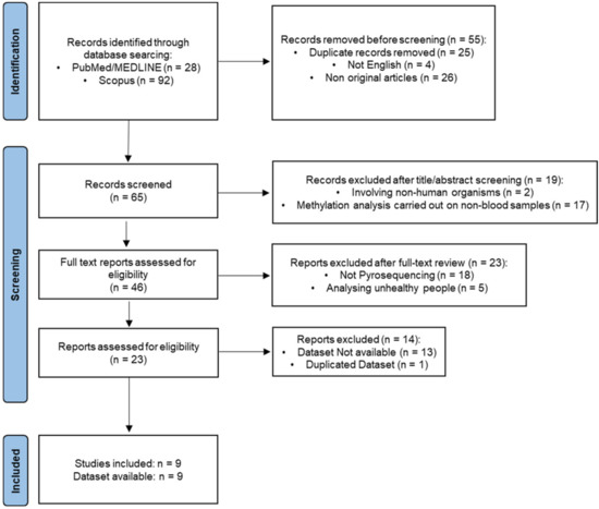 Figure 1 shows the full process of the literature search and study selection. In total, 120 reports were initially identified; 55 records were removed before the screening process: 25 were duplicates, 26 articles did not include original research, and 4 articles were not written in English language for a total of 65 remaining records. Of these, 19 records were excluded based on the title and/or abstract (2 studies involved non-human organisms; 17 studies were carried out on tissues different from blood). Twenty-three studies were excluded after a full-text review: 18 studies did not use pyrosequencing technology for methylation analysis, and 5 were carried out on unhealthy people (e.g., growth disorders, Alzheimer’s disease). Of the 23 remaining records, 13 did not provide a publicly available dataset; the study of Garali [16] and Daunay [14] analysed the same dataset, and we retained the dataset of Garali because it was based on an increased number of technical replicates obtained from the same 100 blood samples analysed in Daunay [14]. Consequently, 9 independent datasets from 9 different articles were included in this meta-analysis (Table 2).