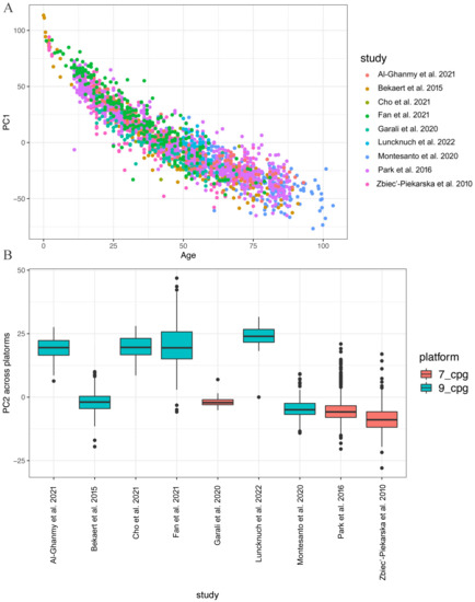 (A) Plot of PC1 versus age at recruitment, coloured by study; (B) plot of PC2 versus the assay. Source: [8,15,16,20,21,22,23,24,25].