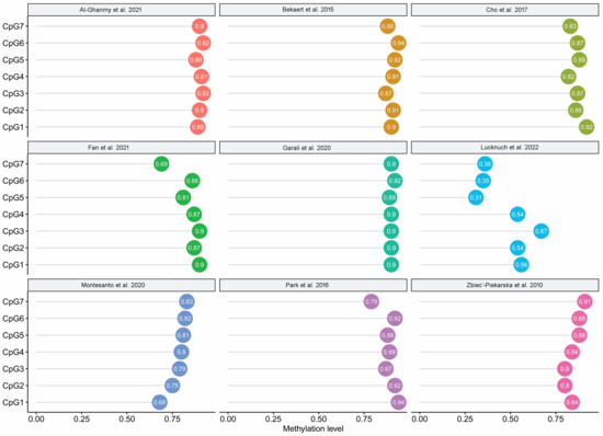 With the exception of the values obtained for the dataset of Lucknuch et al. [23], the analysed CpG sites all presented a strong positive correlation with age at recruitment (r > 0.68), indicating that they could all be good estimators of chronological age (Figure 3).