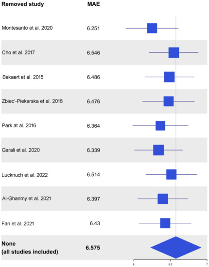 Forest plot presenting the results of the sensitivity analysis for the linear model. Each row reports the results obtained removing a single dataset, except for the final row, which presents the results based on the entire sample set. Results are reported as MAE, along with a graphical representation of the MAE and its confidence interval. Source: [8,15,16,20,21,22,23,24,25].