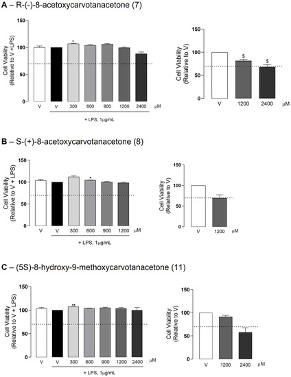 The results in Figure 1 show that in the LPS-treated cells, none of the test compounds (7, 8 and 11) had cytotoxic effects at the concentrations tested. The highest concentration of compound 8 (2400 μM) was not completely miscible with the aqueous medium due to the fact of its lipophilicity, and thus, it was not tested. Although results for some concentrations showed statistically significant differences relative to the cells treated with LPS alone, the effect sizes were very small and, thus, biologically irrelevant. On the other hand, in the absence of LPS, the absorbance intensity in the cells treated with the test compounds decreased to variable extents, although only the highest concentration of (5S)-8-hydroxy-9-methoxycarvone (11) caused a decrease higher than 30% relative to the control cells, which, thus, can be considered as representing cell toxicity. Nonetheless, the effect size was small, with the remaining metabolic activity achieving 57.80% of that in the control cells.