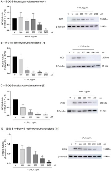 The compounds framed by rectangles in Scheme 1, –S-(+)-8-hydroxycarvotanacetone or S-(+)-8-hydroxycarvone (4), R-(−)-8-acetoxycarvotanacetone or R-(−)-8-acetoxycarvotanacetone (7), S-(+)-8-acetoxycarvotanacetone or S-(+)-8-acetoxycarvone (8) and (5S)-8-hydroxy-9-methoxycarvotanacetone or (5S)-8-hydroxy-9-methoxycarvone (11), were obtained in sufficient amounts to proceed to the in vitro evaluation of cytotoxicity and anti-inflammatory activity. Since we previously evaluated the cytotoxicity of S-(+)-8-hydroxycarvone (4) and its ability to inhibit LPS-induced NO production, this compound was only tested for the evaluation of iNOS and pro-IL-1β protein levels.