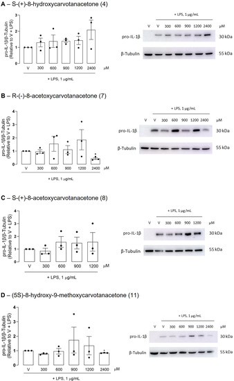 To further confirm the anti-inflammatory properties of the test compounds, iNOS and IL-1β protein levels were evaluated by Western blotting. All test compounds significantly decreased the LPS-induced iNOS protein levels in Raw 264.7 macrophages, although at different concentrations (Figure 3). Despite the inter-assay variability that prevented statistically significant results to be obtained with some concentrations of each test compound, the results clearly show that compounds 7 and 8 were the most effective in inhibiting LPS-induced iNOS expression, in agreement with the IC50 values obtained for the inhibition of NO production. IL-1β is produced as a precursor form, pro-IL-1β, which is partially cleaved before being secreted. Pro-IL-1β is cleaved by caspase-1, which is activated by a multiprotein complex, termed inflammasome, in response to a variety of inflammatory stimuli [30]. Thus, even when the IL-1β expression is strongly induced, as in response to LPS, its intracellular levels are usually low or undetectable, and only the unprocessed form with a molecular weight of approximately 30 kDa can be detected, for instance, by Western blotting. The antibody used in this study recognizes an amino acid sequence that is present in both the immature and mature IL-1β forms. Unexpectedly, only the highest concentration of R-(−)-8-acetoxycarvone (7) decreased pro-IL-β levels significantly relative to cells treated with LPS alone (Figure 4). On the contrary, the other test compounds showed a tendency to increase the pro-IL-1β levels. Even though statistical significance was not achieved, two out of the three independent assays performed with each compound showed large increases in pro-IL-1β levels compared to cells treated with LPS alone.