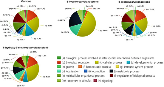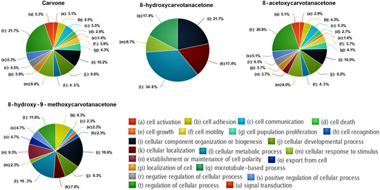 Since the number of predicted targets for each compound was very large, we selected only those with relative affinities above 90% for further analysis. For the enrichment analysis, the different biological processes were grouped according to the respective parental term (Figure 5). The results show that carvone was the compound that targets proteins involved in more biological processes (378), followed by 8-acetoxycarvone (281), 8-hydroxy-9-methoxycarvone (51) and 8-hydroxycarvone (25). For all compounds, the parental term with higher representation was “cellular process (c)”, but differences among the compounds were apparent when subdivisions of the parental term, that is, the second parental term, were considered (Figure 6). The second parental term more represented for carvone and 8-acetoxycarvone was “regulation of cellular process (t)”, while “cellular metabolic process (l)” was the most relevant for 8-hydroxycarvone, and for 8-hydroxy-9-methoxycarvone it was “cellular component organization or biogenesis (i)”. Considering all of the cellular processes affected by each compound, it was possible to identify different patterns. Carvone and 8-acetoxycarvone affected a large number of similar processes (16 and 17, respectively), while 8-hydroxycarvone affected only five, and 8-hydroxy-9-methoxycarvone affected an intermediate number of processes (13) of which the top two (i and l) were the same more significantly affected by 8-hydroxycarvone.
