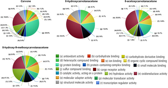 Regarding the molecular functions of the targeted processes, the enrichment analyses demonstrated that the 8-acetoxycarvone targets were involved in more molecular functions (97) than those targeted by carvone (64), 8-hydroxy-9-metoxycarvone (39) and 8-hydroxycarvone (36), in agreement with the observations relative to the numbers of biological and cellular processes affected by each one. Considering the parental terms corresponding to the different molecular functions (Figure 7), carvone showed a higher probability of modulation of protein binding, followed by oxireductase activity, while the other three compounds affected proteins with similar functions, but with an inverse probability, that is, the proteins affected by these compounds were more probably involved in oxireductase activity, followed by protein binding.