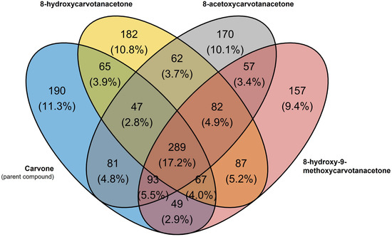 A Venn diagram to compare the obtained targets (rank > 90) for 8-acetoxycarvotanacetone, 8-hydroxy-9-methoxycarvotanacetone, 8-hydroxycarvotanacetone and carvone was performed using the ggvenn package [42] in RStudio (version 4.1.1) [43].