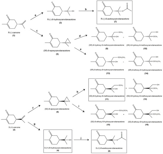 Scheme 1 shows the structures of the derivatives that were synthesized starting from R-(−)- or S-(+)-carvone and their respective synthesis processes.