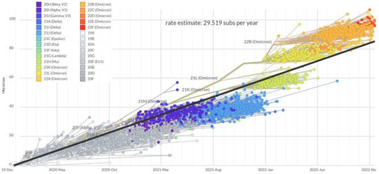 - Bloom, J.D.; Beichman, A.C.; Neher, R.A.; Harris, K. Evolution of the SARS-CoV-2 mutational spectrum. bioRxiv 2022, 2022.2011.2019.517207. [Google Scholar] [CrossRef]