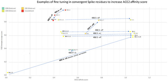 - BA.2.3 already had E484A inherited from the BA.2 parent, but further mutated into 484R in the child BA.2.3.20, which caused an impressive increase in ACE2 affinity (to whom K444R, L452M, and N460K contributed)