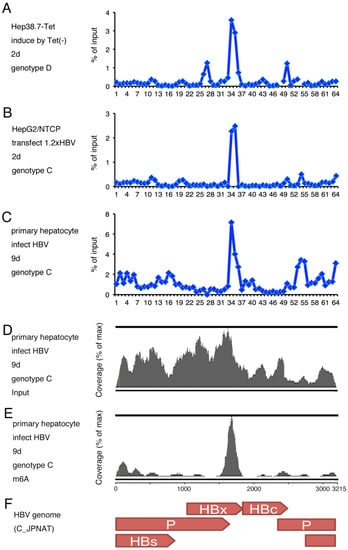 To validate the results, RNA-seq analyses of MeRIP product and input RNA were conducted using the sample of PHHs infected with HBV (Figure 1D,E). The highest m6A peak was in the HBx-coding region (1611–1764 of AB246345.1), which corresponds to the peaks at #34 and #35 (Figure 1E). Figure 1F shows a schematic diagram of HBV genes.
