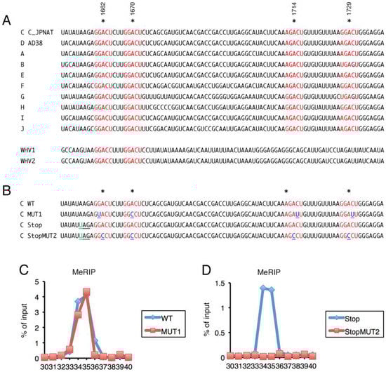 Identification of m6A sites in HBV RNA. (A) Sequence alignment of the region for predominant m6A modifications (#34 and #35) in HBV (C_JPNAT (genotype C), AD38 (genotype D), and other genotypes) and Woodchuck hepatitis viruses (WHV1 and WHV2). Asterisks denote possible m6A sites. Red letters indicate conserved consensus motifs. (B) Mutagenesis of possible m6A sites. Mutated nucleotides were indicated by underlines. The AAG sequence upstream of A1662 was modified to UAG to change the codon to Stop. (C,D) HepG2/NTCP cells were transfected with pUC1.2xHBV with the indicated mutations, incubated for 2 days, and subjected to MeRIP analysis, which was followed by qRT-PCR.