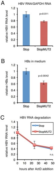 To analyze the effects of the four mutations at m6A sites, HepG2/NTCP cells were transfected with the 1.2xHBV plasmid (Stop or StopMUT2). After 2 days, quantitative reverse transcription-polymerase chain reaction (qRT-PCR) (Figure 3A) and enzyme-linked immunosorbent assay (ELISA) (Figure 3B) were carried out. HBV RNA levels were decreased slightly but significantly (Figure 3A). The HBs protein level in medium was decreased by 36% (Figure 3B). To examine if mutations at the m6A sites affected HBV RNA degradation, de novo RNA synthesis was halted by actinomycin D, which was followed by incubation for 24 and 48 hours (Figure 3C). The degradation rate was similar between Stop and StopMUT2, indicating that the reduced HBV RNA level (Figure 3A) cannot be accounted for by a change in degradation rate.