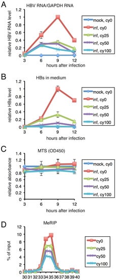 Hepatitis B virus (HBV) is a hepato-tropic enveloped virus with a DNA genome of about 3.5 kb that belongs to the family hepadnaviridae, genus orthohepadnavirus. The virus is transmitted via blood and can be sexually acquired. It is estimated that about two billion people are infected with HBV and 300 million are persistently infected worldwide [1]. HBV is prevalent mostly in developing countries, but it is also present in developed countries. Symptoms of hepatitis caused by HBV infection include fever, nausea, hypochondrial pain, and jaundice. After chronic hepatitis, some patients develop liver cirrhosis or liver cancer [2,3]. An inactivated HBV vaccine is available worldwide, and immunoglobulin preparations can also be used. For treatment, interferons and reverse transcriptase inhibitors are used to suppress HBV. However, in many cases, these drugs do not completely eliminate HBV. Therefore, novel, effective antivirals are needed. However, the development of new antivirals is hampered by the complex lifecycle of HBV and an incomplete understanding of the mechanisms underlying its replication and persistence [4,5].