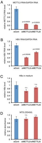 siRNAs were transfected into HepG2/NTCP cells using Lipofectamine RNAiMAX reagent (ThermoFisher Scientific) 1 day before and 3 days after HBV infection (4 days after the initial siRNA transfection). The sequences of the siRNAs for the control and METTL3 were as follows: siControl, GCAGAGCUGGUUUAGUGAAtt (sense) and UUCACUAAACCAGCUCUGCtt (antisense); siMETTL3i, GCGAGGUCUCCUACAAGAUtt (sense) and AUCUUGUAGGAGACCUCGCtt (antisense); siMETTL3ii, GCAAGUAUGUUCACUAUGAtt (sense) and UCAUAGUGAACAUACUUGCtt (antisense).