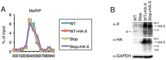 Since it was reported that HBx was crucial in m6A modification of viral RNA [19], we tested whether methylation was affected by disruption of the HBx gene or exogenous overexpression of the gene product. The WT or Stop strain of 1.2xHBV shown in Figure 2 was co-transfected with an HA-tagged HBx expression vector or its empty vector. A stop codon was artificially introduced into the HBx gene in the Stop mutant, but the methylated adenosine residues (A1662, A1670, A1714, and A1729) were intact. Two days after transfection, RNA was harvested and subjected to MeRIP assay (Figure 6). Loss of HBx protein by point mutation (Stop) had little or no effect on HBV RNA methylation when compared to WT (Figure 6A). Western blotting confirmed that the X protein was present in the WT sample, while the band was very weak in the Stop sample (Figure 6B, anti-X). The m6A level of HBV RNA was not increased nor decreased at all by the exogenous supply of the protein (+HA-X) to either WT or Stop (Figure 6A). The production of HA-tagged HBx protein was confirmed by Western blotting using anti-HA antibody (Figure 6B).