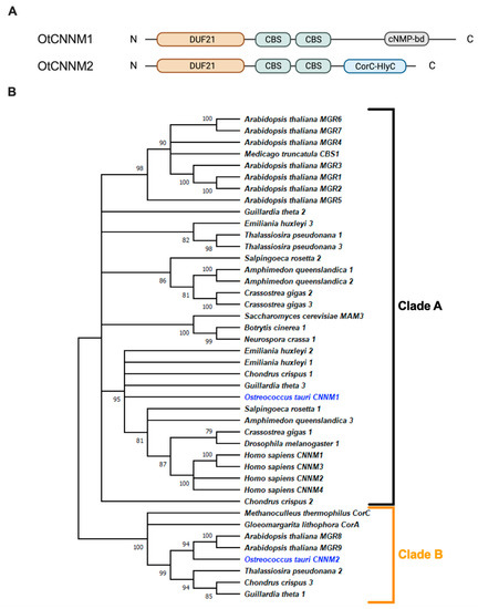 Structure and ancestry of two Ostreococcus CNNM proteins (marked blue). (A) Schematic diagram of the structure of the CNNM proteins found in Ostreococcus tauri. (B) Maximum likelihood (ML) phylogenetic tree (100 bootstraps) of whole protein sequences for CNNM homologs.