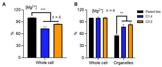 CNNM proteins affect subcellular magnesium homeostasis. Relative quantification of total [Mg2+] in the CNNM-overexpressing lines for whole-cell extracts (A) and organelle fractions (B). Data are relative to [Mg2+] in the parent line in panel (A), and relative to [Mg2+] in whole cell extracts in panel (B). Data are presented as the mean ± SEM. n = technical replicate number. ** = p < 0.01, *** = p < 0.001; Student’s t-test.