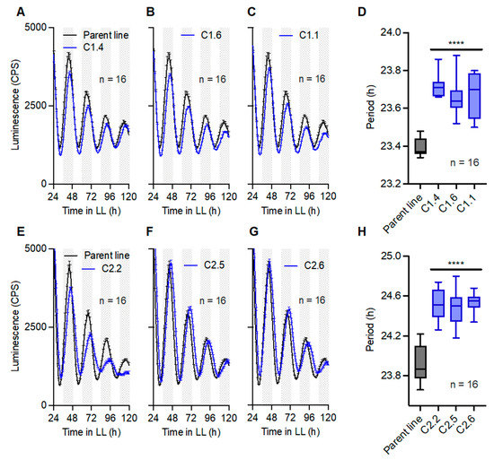 CNNM proteins affect circadian clock gene expression rhythms. Luminescent CCA1-LUC rhythms and period analyses under LL for lines overexpressing CNNM1 (A–D) and CNNM2 (E–H). Luminescent data are represented as mean ± SEM. Period data are shown as boxplots, where middle lines indicate the median, lower and upper boundaries represent the 25th and 75th percentiles, respectively, and error bars show data distribution from lowest to highest value. n = technical replicate number. Grey areas represent subjective night periods. **** = p < 0.0001; statistical analyses are compared with the parent line; Student’s t-test. CPS = Counts per second, h = hours.