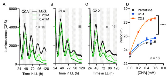 Previous studies have established cell treatments that inhibit or alter Mg2+ transport, such as Cobalt(III)hexammine (Co(NH3)62+, CHA) [3,15]. CHA is known to interfere and specifically block Mg2+ transport, leading to severe phenotypes as abolished Mg2+ rhythmicity [3]. To test whether the circadian defects observed in overexpressing lines of CNNM proteins (Figure 3) are directly caused by the differential accumulation of Mg2+ in these lines (Figure 2), we next treated the CNNMox lines with a wide range of [CHA] to test the sensitivity of the clock compared with the parent line. CHA treatments led to dose-dependent circadian period lengthening in the parent line (Figure 4A), consistent with previous results [3], as well as in the overexpression lines (Figure 4B–D). The effect of CHA on circadian rhythms in a line overexpressing CNNM1 was similar to that observed in the parent line. However, the effect of the overexpression of CNNM2 on circadian period was strikingly synergistic with CHA treatments. The synergy of CHA and CNNM2 overexpression on lengthening circadian rhythms implies that both treatments influence the clock through two separate cellular mechanisms. This result indicates that differential subcellular localization and/or the different domain architecture of Clade A and B of CNNM proteins leads to a differential sensitivity to the Mg2+ transport blockage.