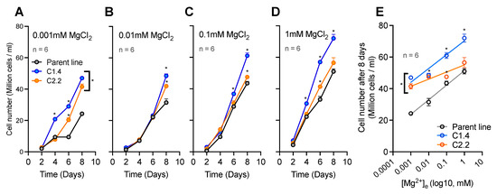 Ostreococcus growth rates were quantified by counting changes in the cell number using a hemocytometer with a light microscope at 40× magnification. The same starting cell density from 1-week-old cultures was resuspended and incubated in different low-Mg media under LL conditions, and the cell number was counted every 2 days. Data from at least 5 technical replicates for each time point were plotted.
