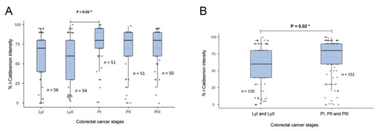Relationship between l-CaD expression and colorectal cancer tumor stage. (A) l-CaD expression by detailed tumor stage; (B) l-Cad expression by grouped tumor stage showing a significant relationship between l-CaD and primary tumor stage. Ly, lymph node stage; PI-III, primary tumor stages I-III; * p < 0.05.