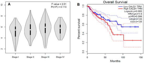 In silico analysis of CALD1 genes in the TCGA colon adenocarcinoma cases. (A) Stage plot showing CALD1 gene expression in various tumor stages of the colon adenocarcinoma cohort of the TCGA dataset (n = 275). (B) Kaplan–Meier survival curve shows the overall survival analysis of the cases of TCGA colon adenocarcinoma according to CALD1 gene expression status. The solid line represents the survival curve and the dotted line represents the 95% confidence interval; HR = 1.5; p(HR) = 0.98, n = 270. The study was performed using GEPIA at http://gepia.cancer-pku.cn/index.html (accessed on 1 December 2022).