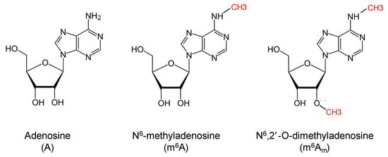 Chemical structures of adenosine (A), N6-methyladenosine (m6A), and N6,2′-O-dimethyladenosine (m6Am). Methyl groups are indicated in red.