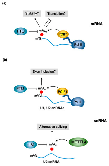 Regulators of m6Am modification. (a) PCIF1 methylates the first transcribed 2′-O-methyladenosines, when present, producing m6Am during primary mRNA transcription. This modification can be removed in the cytoplasm by FTO demethylases. The consequences of cap m6Am deletion are still under debate. It was reported that m6Am can increase mRNA translation, decrease mRNA translation, increase mRNA stability, and not affect mRNA stability (see main text for details). (b) Different snRNAs, including U1 and U2, contain m6Am on their caps and this methylation is established by PCIF1 and removed by FTO. In addition, the U2 snRNA contains an internal m6Am site that is installed by METTL4 and whose deletion causes altered alternative splicing.