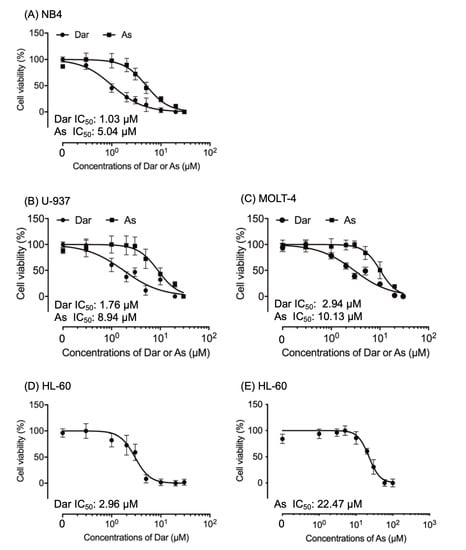 2.1. More Potent Cytotoxicity Induced by Darinaparsin in Comparison with AsIII in Human Leukemia Cell Lines