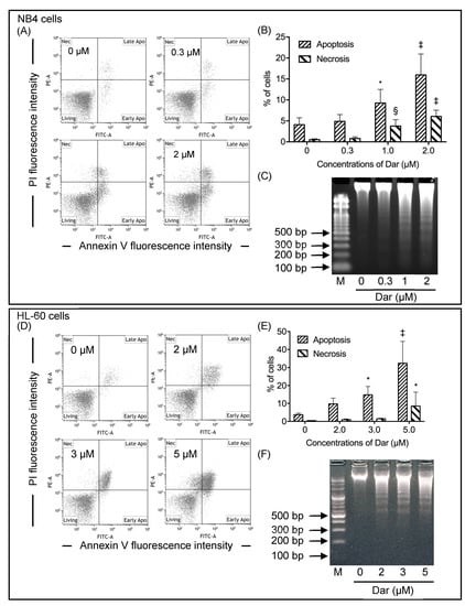 Induction of apoptosis and necrosis in NB4 and HL-60 cells treated with darinaparsin. Determination of apoptosis was conducted following treatment with various concentrations of darinaparsin for NB4 cells (0.3, 1, and 2 μM) (A–C); and for HL-60 cells (2, 3, and 5 μM) (D–F), for 24 h. After treatment, cells were stained with annexin V-FITC and PI and analyzed by flow cytometry as described in the “Materials and Methods” section. Annexin V(−)PI(−) cells, annexin V(+)PI(−)/PI(+) cells and annexin V(−)PI(+) cells represent viable cells, apoptotic cells, and necrotic cells, respectively. Representative flow cytometry dot plots from three independent experiments (A,D), and the quantification of the percentages of apoptotic and necrotic cells (B,E) were shown. DNA electrophoresis patterns were shown after treatment with indicated concentrations of darinaparsin for 24 h (C,F). *, p < 0.05; §, p < 0.001; ‡, p < 0.0001 vs. control. Dar, darinaparsin.