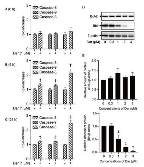 Caspase activation associated with Bid truncation in NB4 cells treated with darinaparsin. Following treatment with 1 µM darinaparsin for 6 h (A), 9 h (B) and 24 h (C). The activities of caspase-8, -9, and -3 were measured using a caspase fluorometric assay kit as described in the “Materials and Methods” section. After treatment with various concentrations of darinaparsin (0.3, 1, 2 and 3 µM) for 24 h, the expression profiles of Bcl-2 and Bid were analyzed using Western blotting. Representative image of the expression profiles of the Bcl-2 and Bid proteins are shown from three independent experiments (D). The densitometry of protein bands was analyzed using a program, NIH ImageJ 1.53k. The relative expression levels were expressed as the ratios between each protein and β-actin protein expression levels and were compared with those of an untreated control group (E). Results are shown as the means ± SD from three independent experiments. †, p < 0.01; §, p < 0.001; ‡, p < 0.0001 vs. control. Dar, darinaparsin.