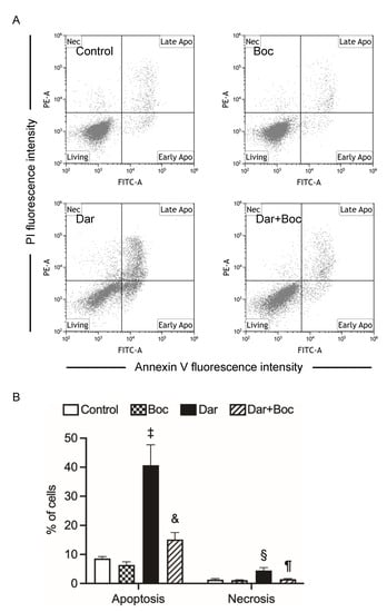 Suppression of darinaparsin-mediated cell death by Boc-D-FMK in NB4 cells. After treatment for 24 h with 1 μM darinaparsin in the presence or absence of 10 μM Boc-D-FMK, a pancaspase inhibitor, cells were stained with annexin V-FITC and PI and analyzed by flow cytometry as described in the legend of Figure 2. Representative flow cytometry dot plots from three independent experiments (A), and the quantification in the percentages of apoptotic and necrotic cells (B) are shown. Results are shown as the means ± SD from more than three independent experiments. §, p < 0.001; ‡, p < 0.0001 vs. control; ¶, p < 0.01; &, p < 0.001 vs. darinaparsin. Dar, darinaparsin; Boc, Boc-D-FMK.
