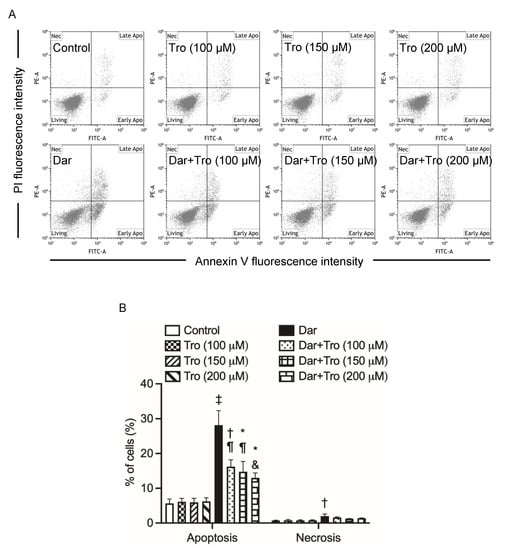 Previous studies have demonstrated the involvement of oxidative stress in the mechanism of action of darinaparsin [12,33]. To clarify the correlation of oxidative stress with darinaparsin-mediated cell death, NB4 cells were treated with 1 μM darinaparsin for 24 h in the absence or presence of various concentrations of Trolox (100, 150, 200 μM), a vitamin E analogue. As shown in Figure 5, the addition of Trolox significantly suppressed darinaparsin-mediated apoptosis in a dose-dependent fashion. Additionally, a trend towards a decrease in the proportion of necrotic cells was observed. Moreover, it was confirmed that neither apoptosis nor necrosis was altered by Trolox alone.