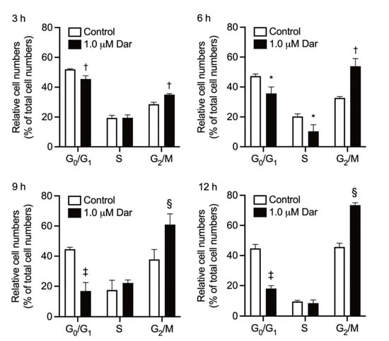 Effect of darinaparsin on cell cycle profiling in NB4 cells. Following treatment with 1 µM darinaparsin for 3, 6, 9 and 12 h, cell cycle analysis was performed by CytoFLEX S flow cytometer as described in the “Materials and Methods” section. Quantifications of the percentages of cells at the G0/G1, S and G2/M phase fractions are shown. Results are shown as the means ± SD from three independent experiments. *, p < 0.05; †, p < 0.01; §, p < 0.001; ‡, p < 0.0001 vs. control. Dar, darinaparsin.